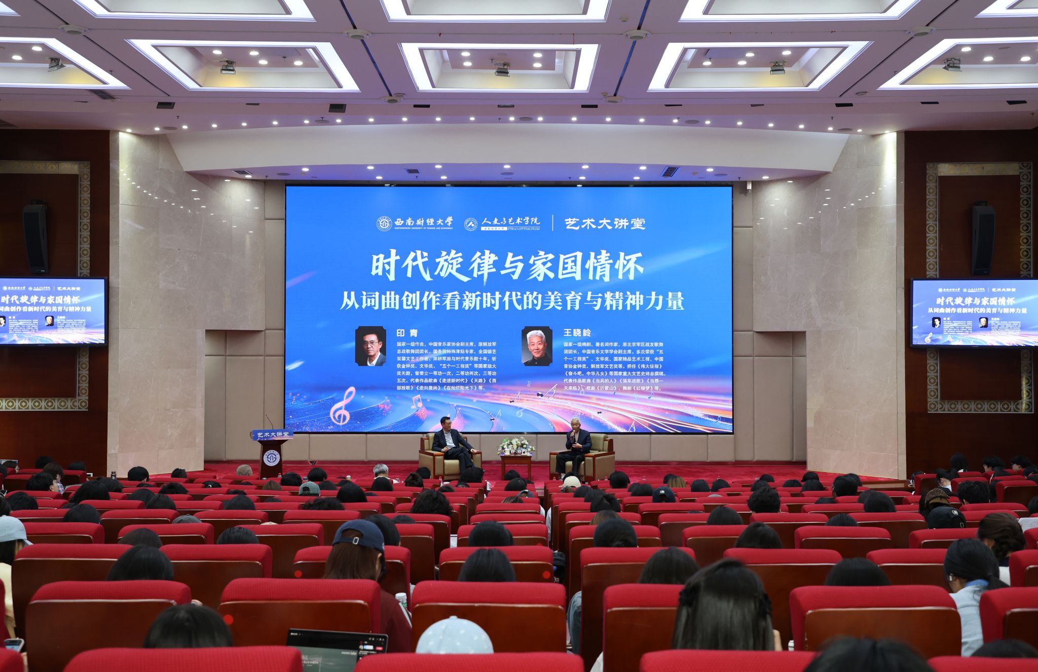 印青的作曲风格既有民族化,又具时代性,他的音乐旋律朗朗上口,充满了青春活泼而又恢宏大气的特点。王晓岭写过很多著名词句,将人民的爱国主义心境表达到极致。讲座现场座无虚席,掌声不断。两位艺术家以对谈讲述形式和独特艺术角度畅谈文艺力量与中国精神,为师生们带来了一场思想深刻、内容丰富、生动形象的美育思政课。他们分享自己成长历练经历,结合亲身创作的《天路》《走向复兴》《强军战歌》等多部音乐作品,讲述艺术人生和创作故事,引导青年学生将优秀艺术作品与个人成长、人民生活、国家发展有机统一起来。他们表示,文艺作品创作要始终坚持增强文化自觉、坚定文化自信,在培根铸魂上展现新担当、在守正创新上实现新作为、在明德修身上焕发新风貌,只有扎根于时代土壤、流淌着家国血脉的作品,才是真正的好作品。讲座最后,印青、王晓岭寄语青年学子:艺术与各学科相通,财经学子也应从艺术中汲取审美养分,始终心怀时代、情系家国,以经典为指引,以美育润心灵,在青春赛场坚定文化自信,以青春笔墨书写时代华章,以青春热血唱响中国力量。
